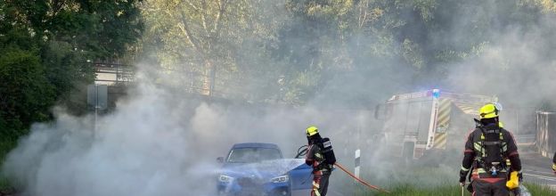 Einsatz am Donnerstagabend für unsere Feuerwehr. Gemeinsam mit der Berufsfeuerwehr wurden wir zu einem brennenden PKW alarmiert. Auf der Ausfahrt der Autobahn war das Fahrzeug in Brand geraten.
