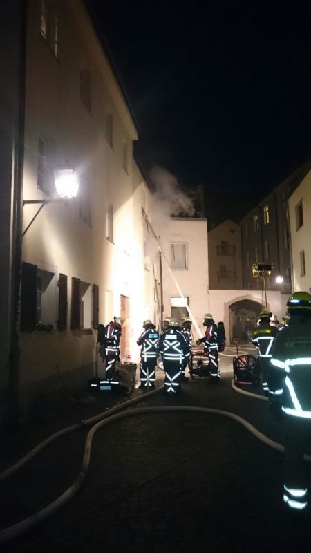 Zwei Personen wurden über eine Steckleiter gerettet. Der Löschzug Winzer baute eine B- Leitung vom Haidplatz her auf und setzte drei Atemschutztrupps ein. Da das Haus und die enge Gasse teils sehr stark verraucht waren, kamen mehrere Überdrucklüfter zum Einsatz.