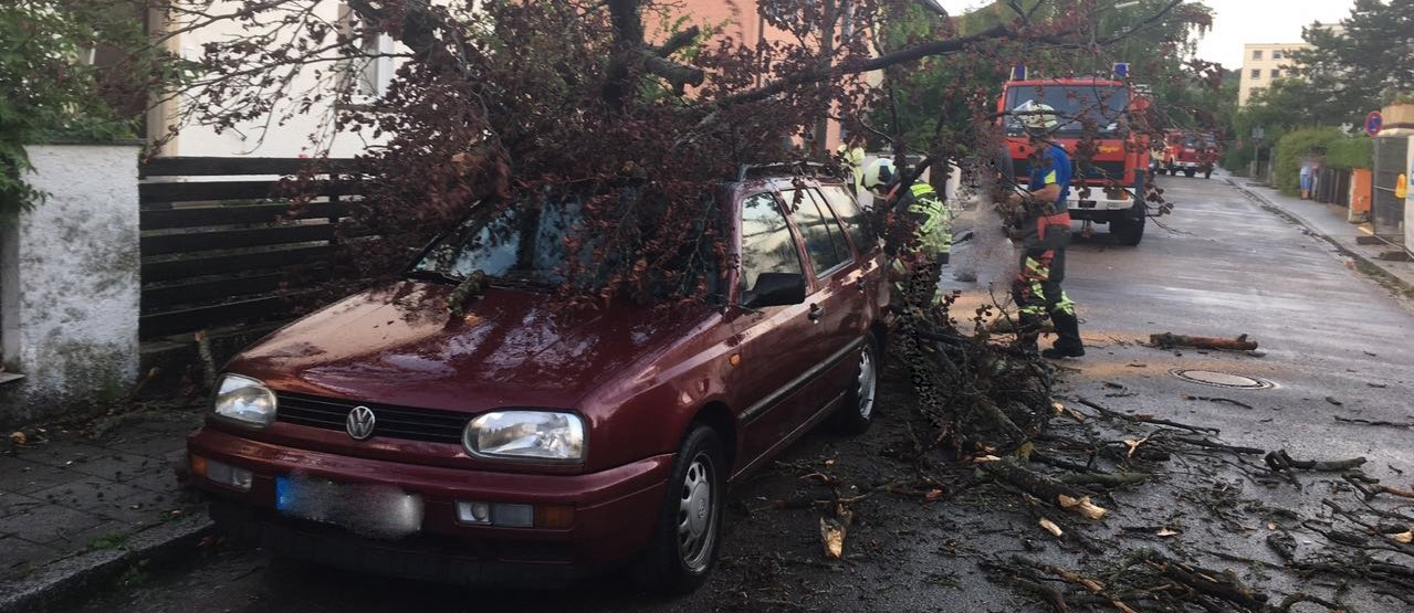 Eine starkes Unwetter zog am Freitagabend gegen 20:00 Uhr über weite Teile Regensburgs hinweg. Um 20.19 Uhr alarmierte uns die Leitstelle Regensburg zu Sturmschäden in den Westen der Stadt. In den folgenden zwei Stunden musste die Feuerwehr Winzer neun Einsätze abarbeiten. Bei einem dieser Einsätze stürzte ein Baum auf ein geparktes Fahrzeug. Glücklicherweise entstand hier zum Sach- kein Personenschaden. Weitere Bäume auf Straßen und Gehwege mußten beseitigt und umgestürzte Bauzäune, die zu Gefährdungen führten, wieder aufgestellt werden. Bei weiteren Einsätzen anderer Einheiten im Stadtgebiet mußte beispielsweise ein Container im Hafenbecken gesichert werden. Neben dem Löschzug Winzer waren die Feuerwehren Altstadt, Oberisling, Schwabelweis, die Berufsfeuerwehr, Harting, Burgweinting und Graß im Einsatz. Wir hoffen auf einen ab jetzt ruhigeren Gewittersommer.